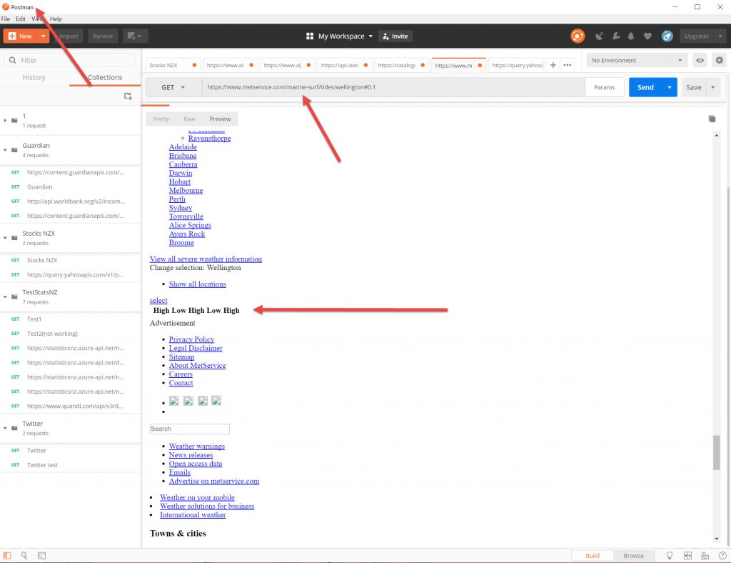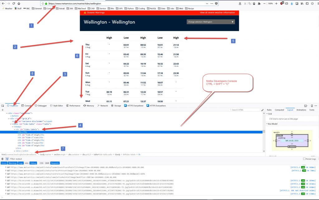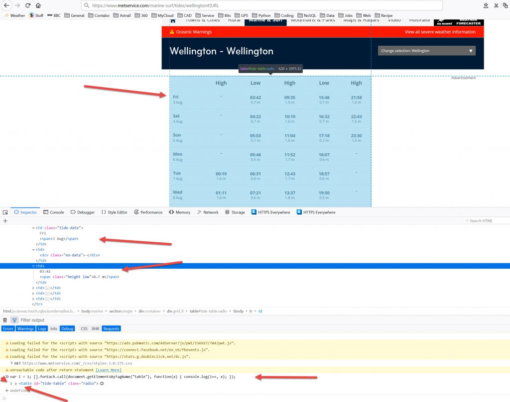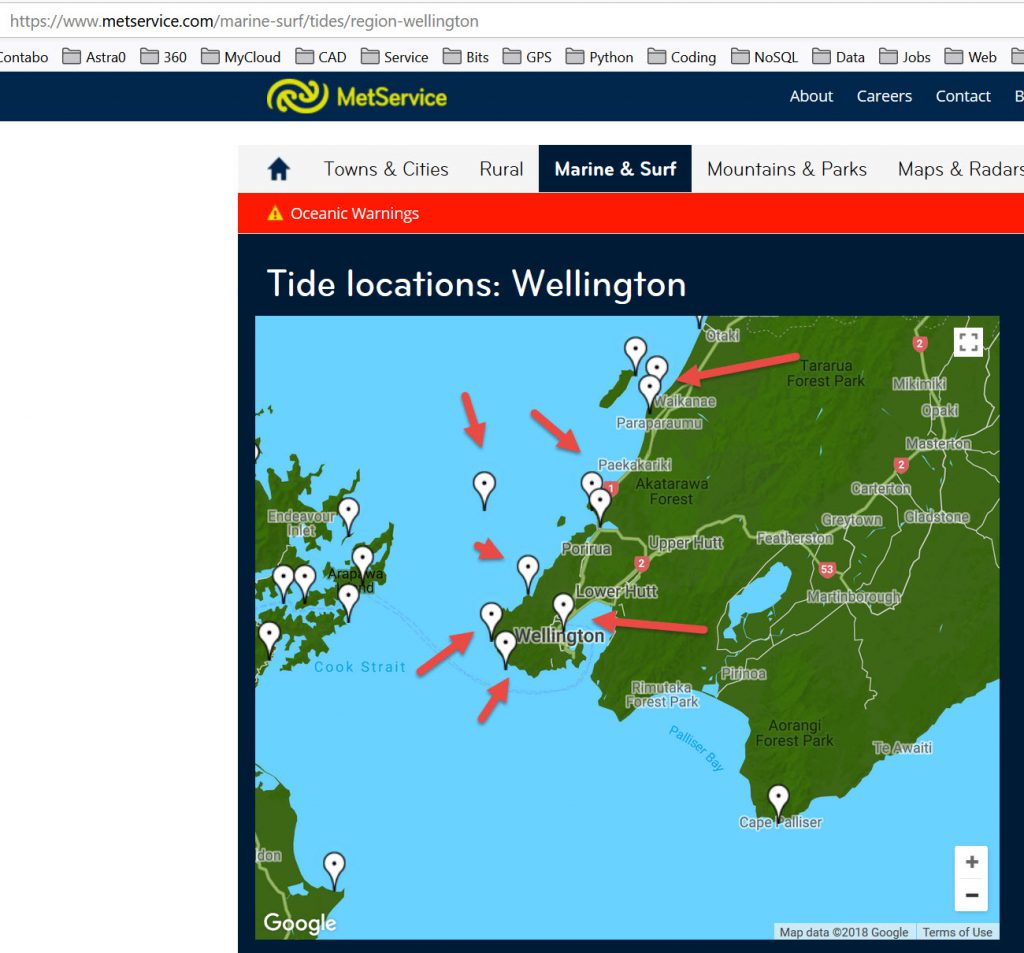 I walk my dog down at Lyall Bay. He much prefers low tide as we can bounce the ball that he chases on the hard sand. So I thought, how do I get tide data around Wellington? Because of the shape of the harbour it has some weird tides, there is a marked difference from Kapiti, Wellington South Coast, Wellington City & the Wairarapa. So I thought, for an exercise, how do I capture tide data? Well, Met Office do not have an API . So I thought I would grab data off a website with tide data. It would be regularly updated (I presume daily) so the data is changing. How to capture it?