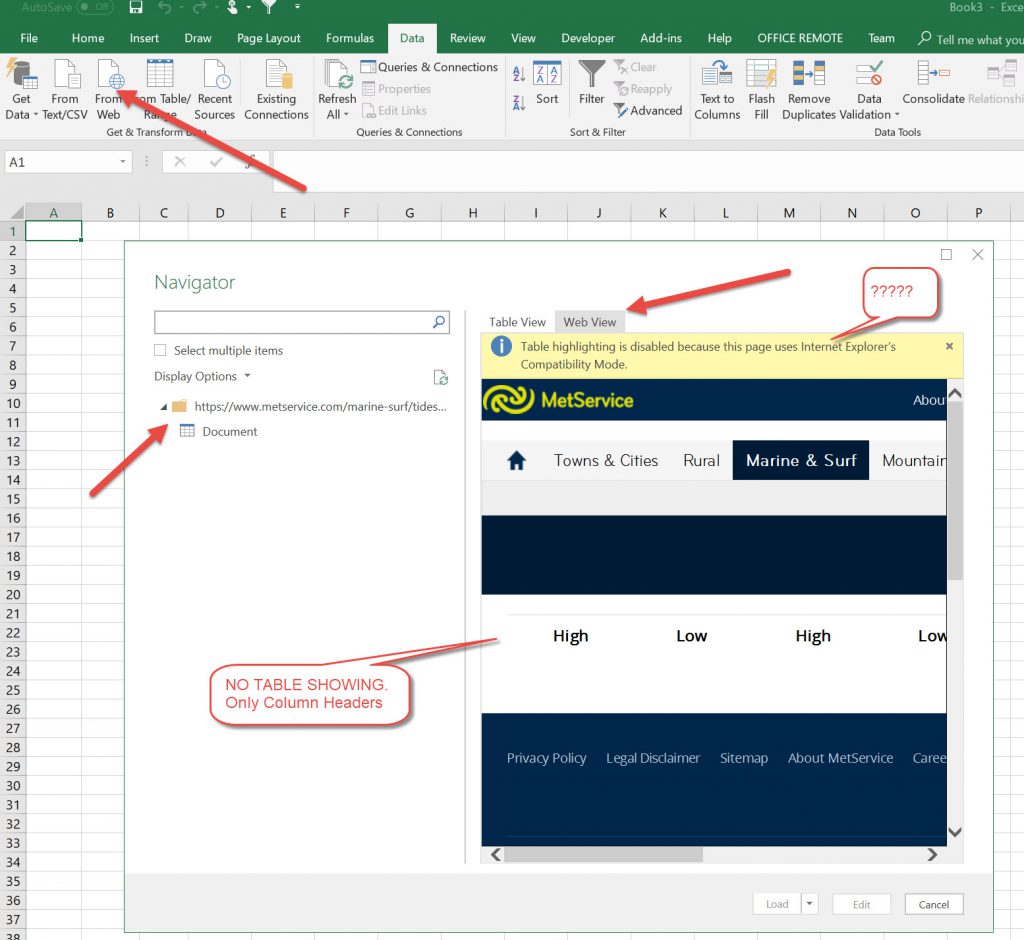 In Excel though, if you look at the Web Viw tab in the Navigator, there is no table shown at all! The only odd thing is the yellow warning that the page uses Internet Explorer’s compatibility mode.
