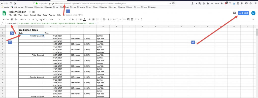 in the cell type =IMPORTHTML("https://www.tide-forecast.com/locations/Wellington-New-Zealand/tides/latest","table",1) and iot takes 3 attributes, the web page, a “Table’ or “List” and which one it is on the page.