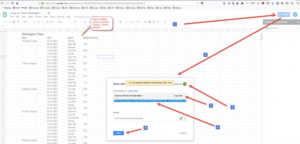 I also brought in a chart of Tide Heights/Time/Date which is posted at the top of the article. I found that you can , with Google Sheets, share a chart directly and put it into its own iFrame. If you size the graph & iframe you can get rid of the scroll bars on the web page, which is definitely neater than in the embedded sheet.