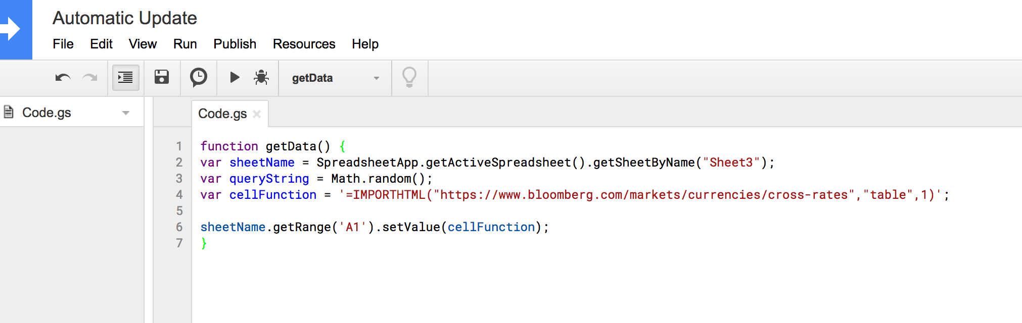 function getData() { var sheetName = SpreadsheetApp.getActiveSpreadsheet().getSheetByName("<sheet-name>"); var queryString = Math.random(); var cellFunction = '=IMPORTHTML("<url>?","table",<index>)'; sheetName.getRange('<import-cell>').setValue(cellFunction); } - Replace