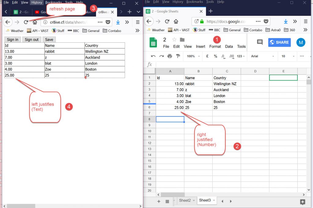 2. On Web it becomes Left Justified, DataType “Text”. So you cannot use the data for number formulas. When sending data back from Web to Spreadsheet it converts the spreadsheet to DataType “Text”. So you cannot do any number manipulation with it.