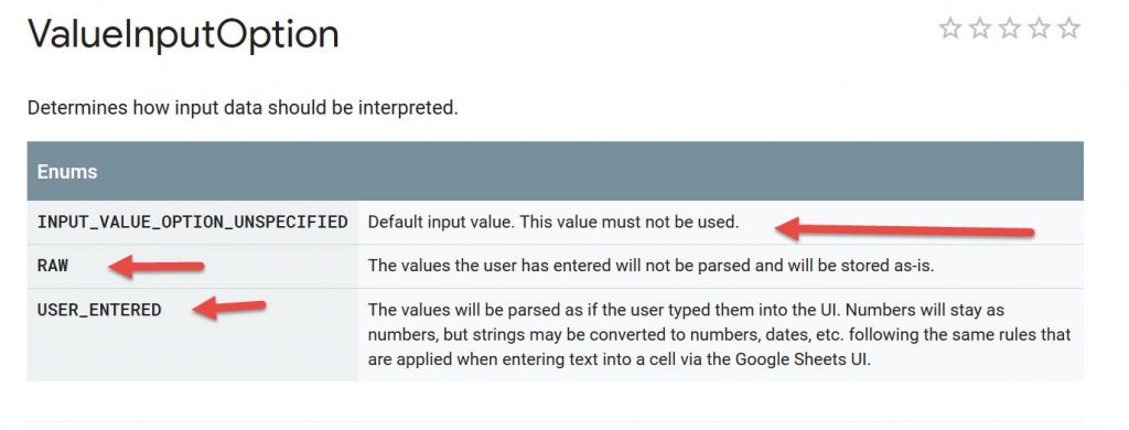 looking at the ValueInputOption page you only seem to have 2 options, see below ( Note, why has it a default that doesn’t work???).
