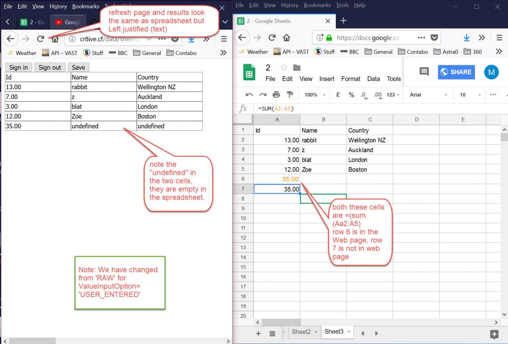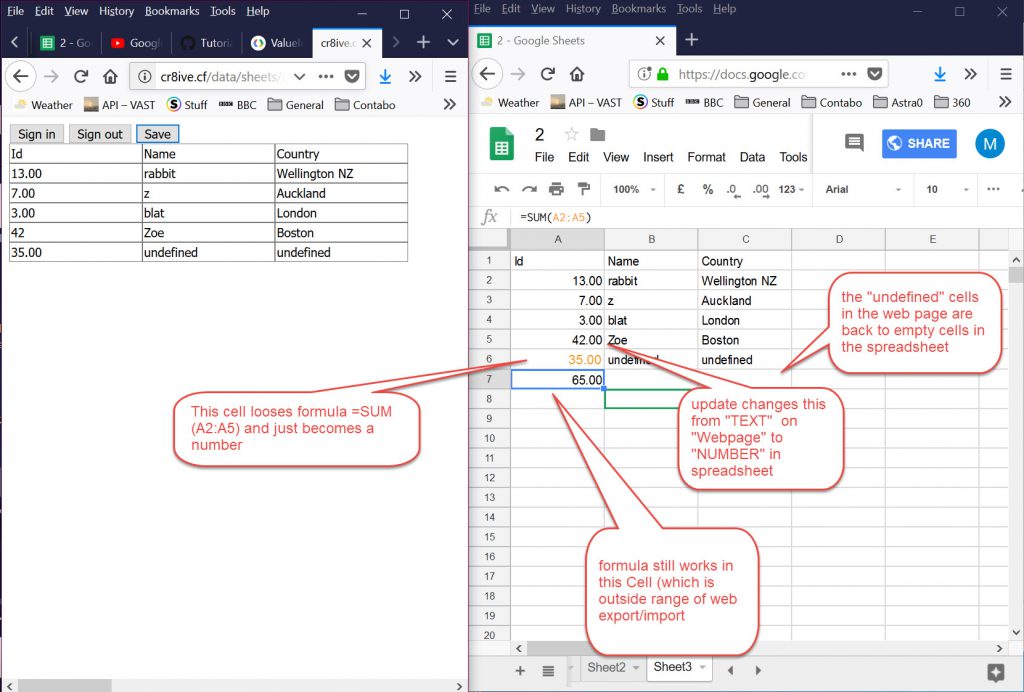 So a “Number” formatted column in the spreadsheet transfers and is displayed as a “Text” formatted column on the Web Page. When it is posted back to the Spreadsheet it converts back to a “Number” column. Any formulae that are in Cells that are displayed on the Web page are lost, but any outside the web page are still function and stay active.