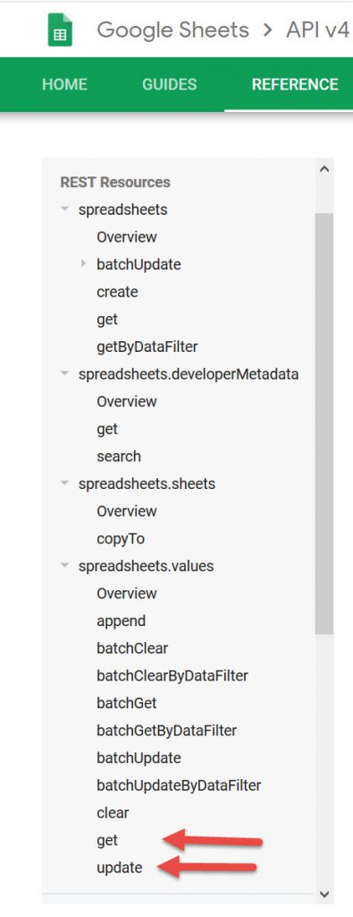 So far, I’ve only been using the GET & UPDATE requests of the Google Sheets API. There are a few more to explore (red arrows are the ones I’ve used so far):
