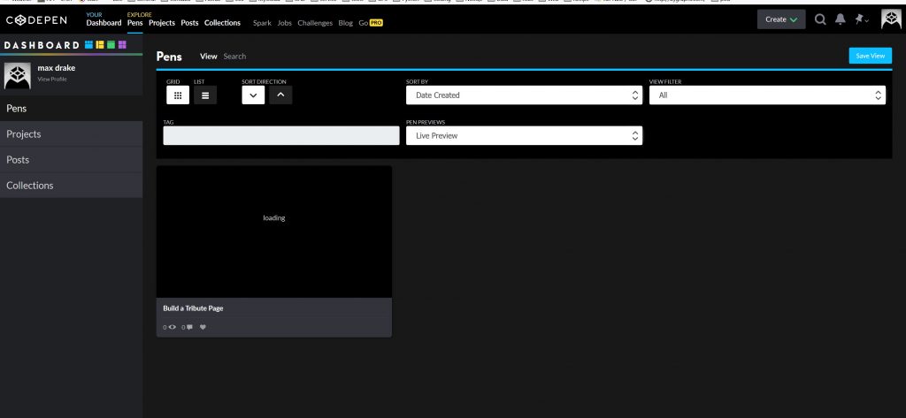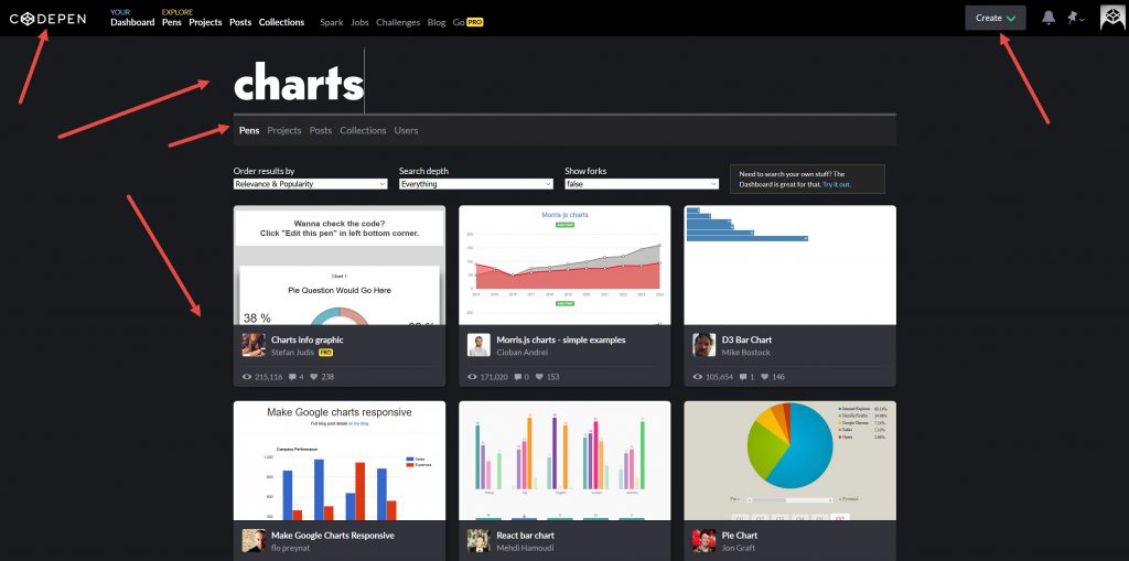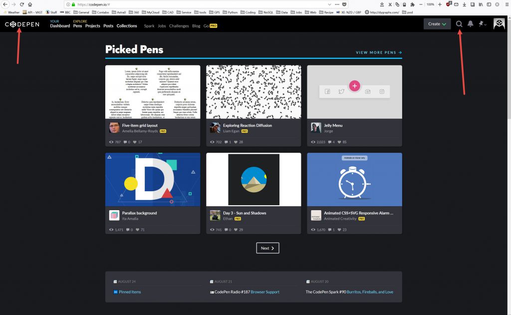 CodePen has a front page with some pens displayed. There you can use the search (top right- see 3 screenshots down) or you can go to your dashboard ( next screenshot after this)
