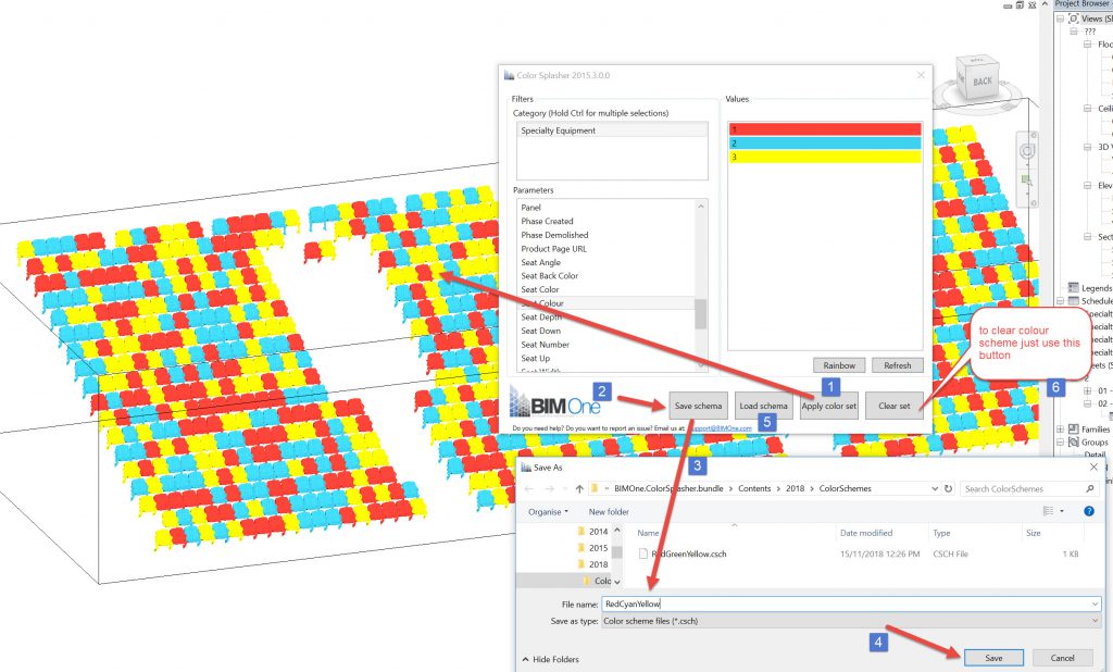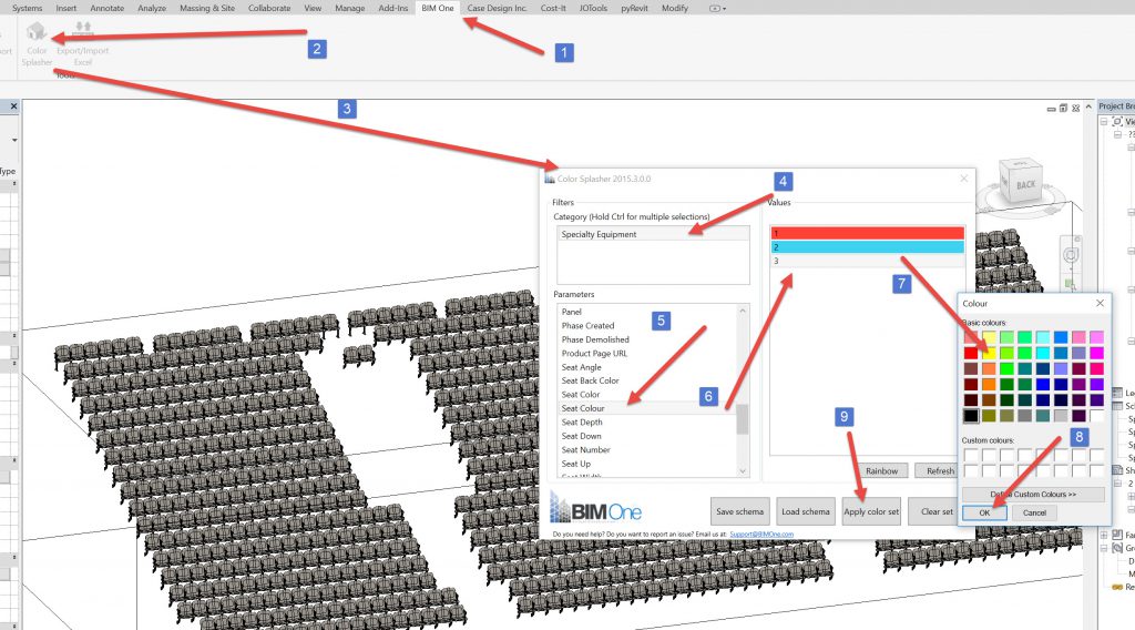 A quick way to check out colour schemes is to use Color Splasher add-in by BIMOne. After opening the add-in select the category that you want to colour, in this case Speciality Equiptment, then choose the parameter that you want to colour. In this case we want Seat Colour. As soon as you have this parameter selected it shows all the instances of that parameter with a different colour against each instance, in this case 1,2 & 3. If you click on the instance, you can select an individual colour to change it, then when you are happy with the colours, you hit the apply color set button and the category will be coloured.