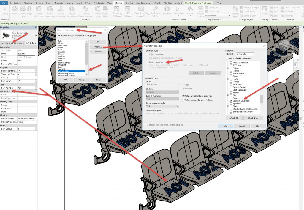 We can just add a project or shared parameter to the Seat category, in this case it is under Speciality Equipment Category. Then we can schedule them. But if we want to tag them then it needs to be a Shared Parameter as project parameters can’t be tagged. So I created a Shared Parameter called “Seat Number” so now the seats can be tagged in 2D as in the 2 images below. This is fine if you want to just display seat numbers in 2D plans. But what do you do if you want the seat numbers in 3D views?