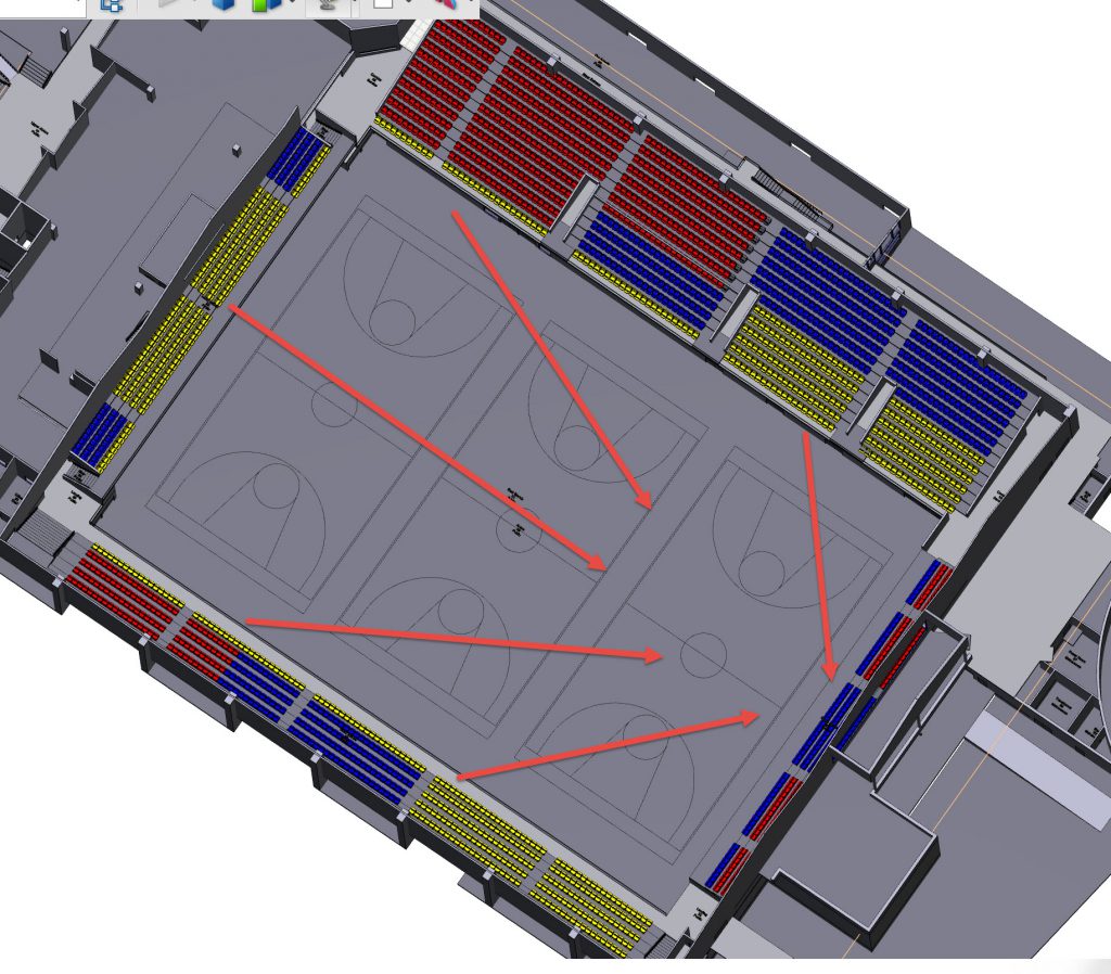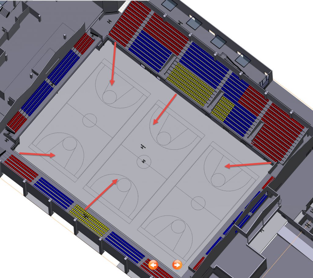 For a basketball event the orientation would be different and so the seats would have a different value. ( I actually think the centre court would be rotated 90 degrees otherwise the yellow seats get a view of the back screen of the hoop), so Yellow high value seats, blue average value and red low value.