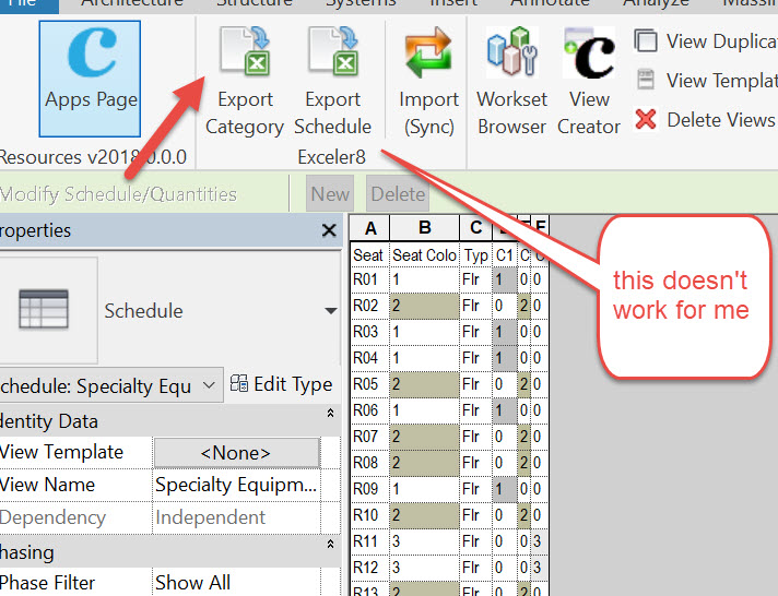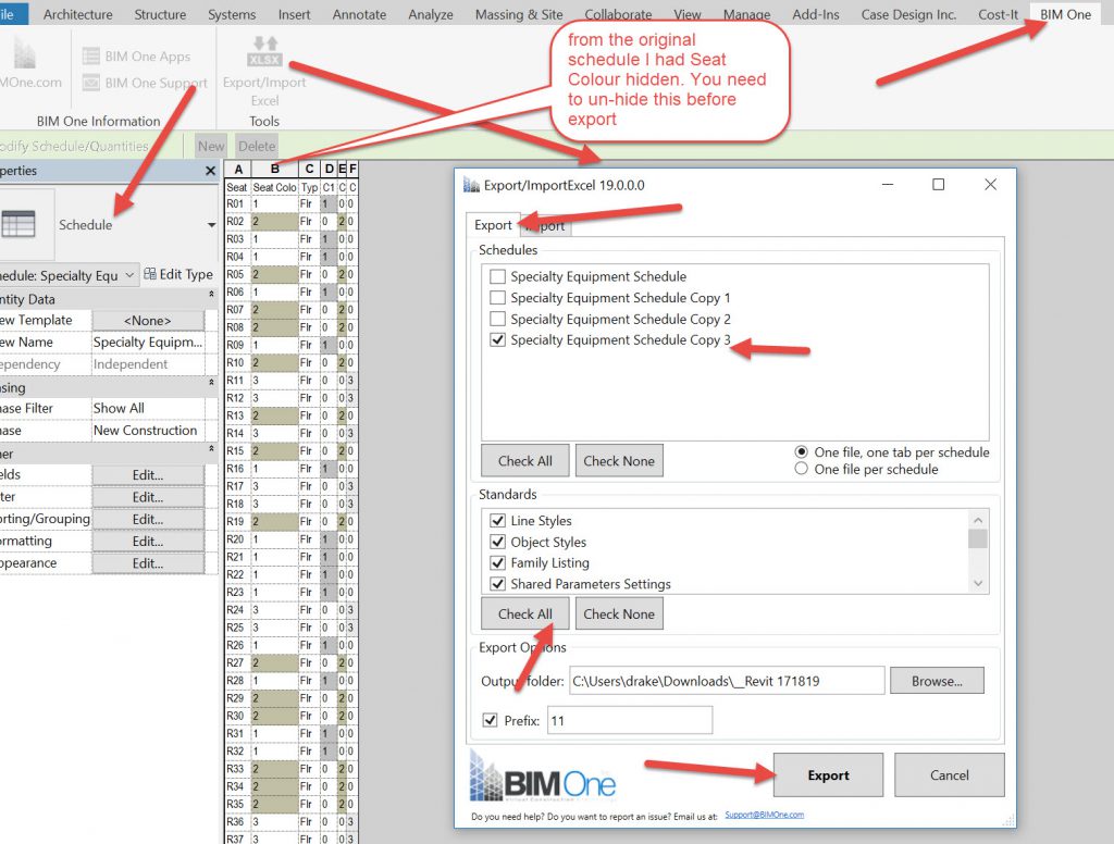 The first time I was using BIM One for this the Seat Colour column data would not come out, and I’ve just realised that its because I had it hidden, oops!). Anyway, export to Excel