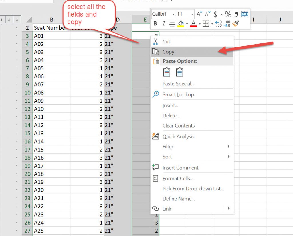 Type in the formula in an empty column on the first line of seats