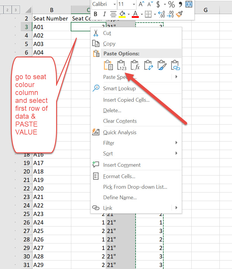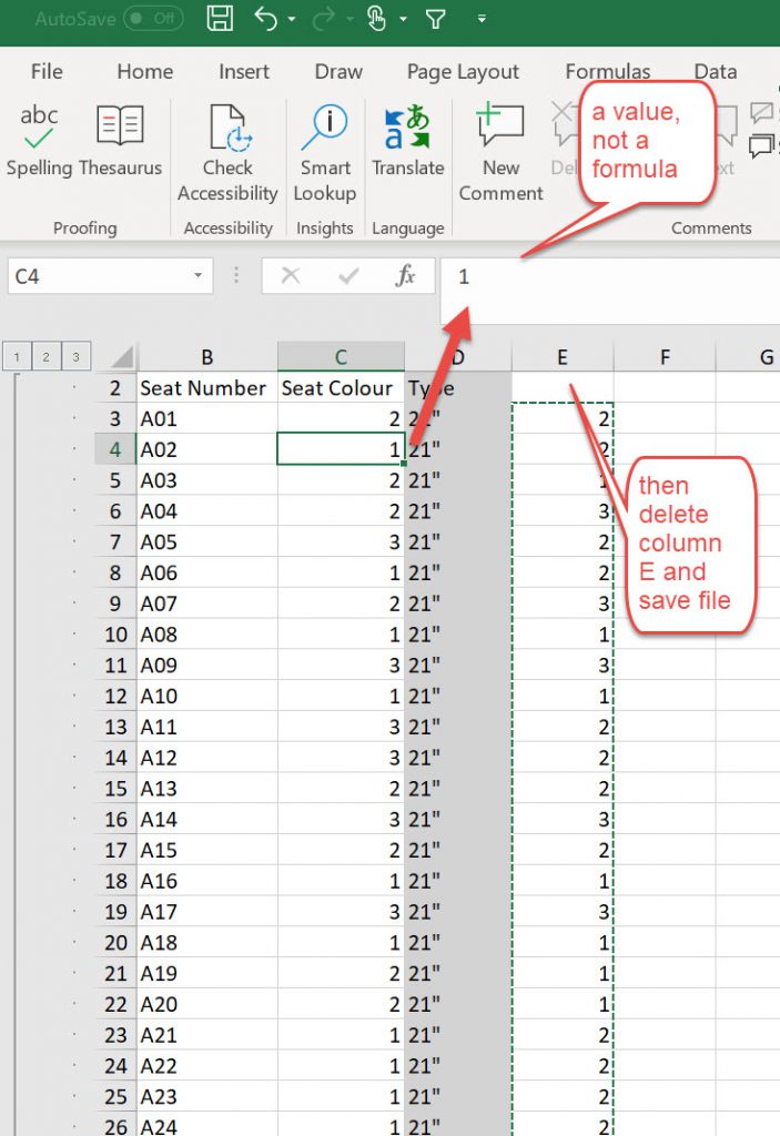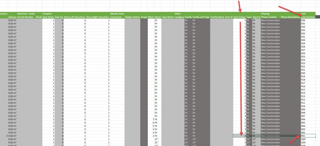 Then copy this down to all the cells, remember that there is the formula in the actual cell, so you need to copy VALUES ONLY otherwise you just copy a formula into the Seat Colour column and that doesn’t work when being imported back into revit Schedule.