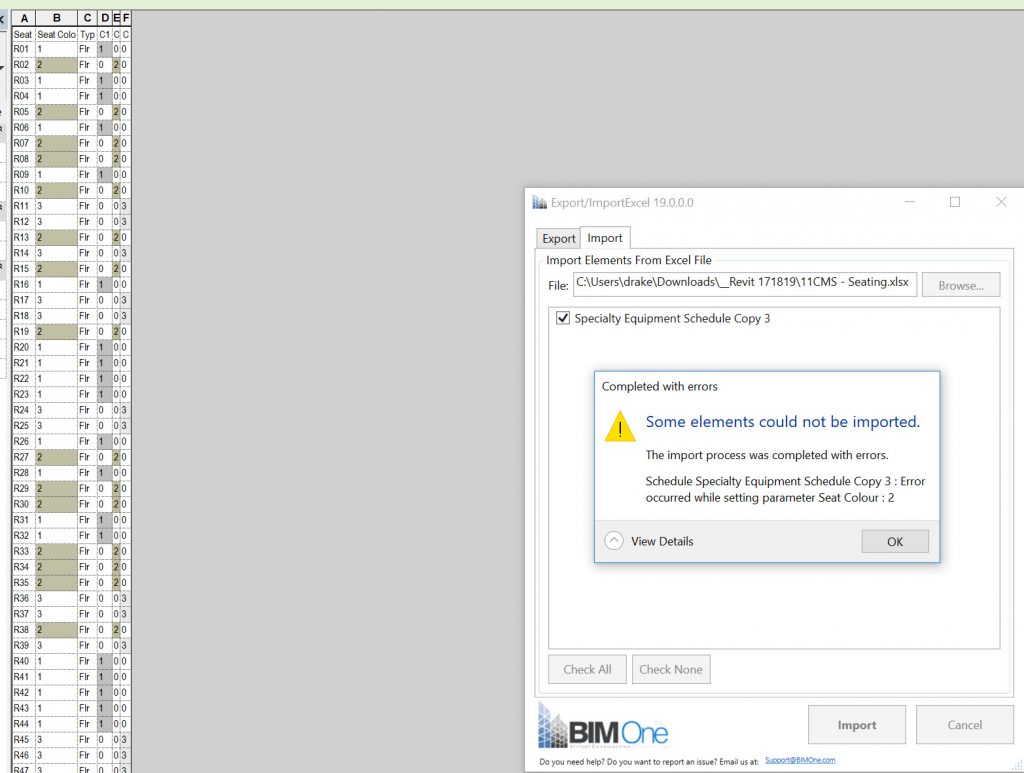 Then use BIMOne to import the excel file back into Revit. Actually, this gives an error.