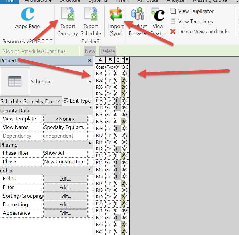 I use BIMOne Export/Import to excel as its free and easy. I sometimes use the Case Apps for exporting categories to Excel (the export schedules to Exceller8 doesn’t work in my Case Apps) and synchronise (see the 3rd image down). There is also another free one out