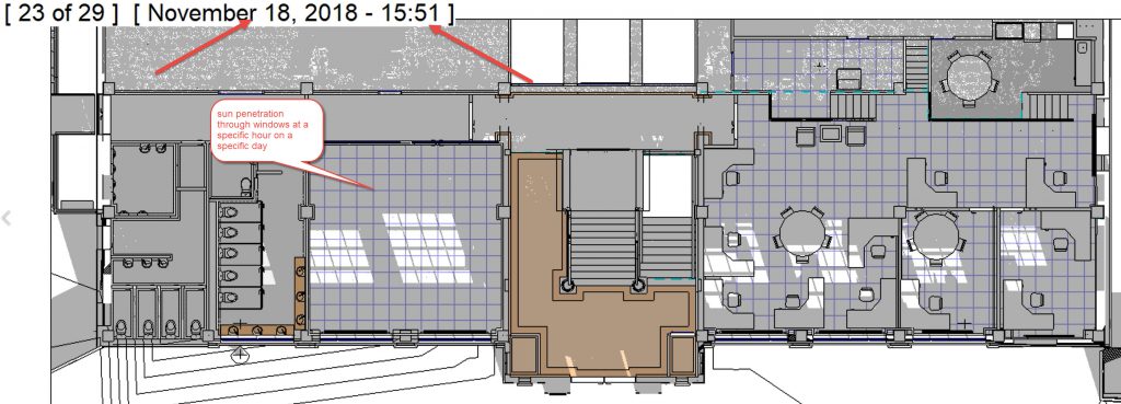 2/ That you can export an AVI of a sun/shadow study for a day/period to send to a client to show level of light penetration into a building at a particular time (or solar shading, if that is your bent.
