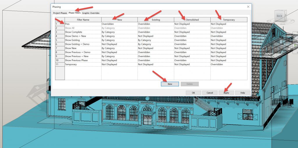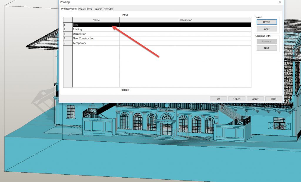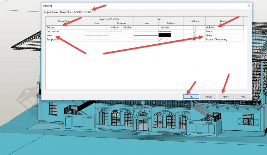 Then in Graphics overrides tab choose a material for Existing- in this case I have some turquoise material, and if you had lots of glass in the new phase you could put the material as Glass. So New & Existing phases are overridden by the material selected.