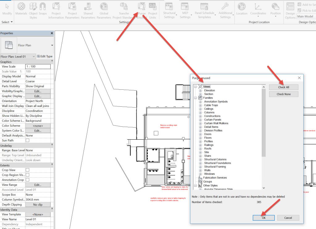 After the file is imported, the save size is 125MB. A bit bigger than the original at 89.5Mb and the IFC at 59Mb. Purging doesn’t seem to have done much as far as file size goes.
