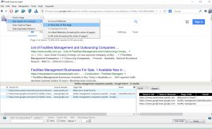 I initially used Outwit to search some Google Search pages like Facility Management Companies US and then set up a scraper to take the Company’s URL and text info from the URL’s listed in the Google search. As I’d set google search results to the maximum of 100 per page it would harvest 100 rows of data that could then be viewed,