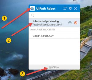 I will take the first one of these and Publish it. If you just publish after installing the Community version of UiPath Studio then you will see, if you fire up the UiPath Robot (which sits in your icon tray) it will show its offline. This means it is only connected to your PC. Not to the Web & Orchestrator.