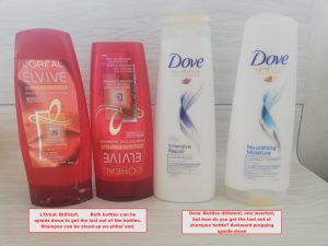 My usual shampoo/conditioner is Dove. The Shampoo bottle has the cap on the top (narrow shaped so cannot be put upside down) and a large base, whilst the conditioner has a large cap and is designed to be upside down, hence drains most of the conditioner at end (apart from having wide shoulders at outlet, and being the most viscous (viscosity = resistance to flow) it does not drain to outlet).