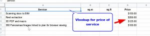With the added complexity of the results from the linked Google Form the spreadsheet VLookup will need to be more sophisticated, in fact , there may need to be multiple VLookups to be able to manage the possible variations for ascertaining prices for the specific service. These may be best managed on different sheets in the workbook so each process can be calculated in a different sheet and the final result of each gets sent back to the main sheet with the calculated cost/price 9that way, if one service needs modifications you only need to deal with a specific sheet in the workbook)