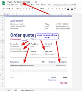 A couple of things I would need to figure out is how to add say 5 days onto the Date of the Form so that the invoice Due date is shown say 5 days later. I suppose it would be better to do this in the Google Sheets and just make a new column, then use that variable.