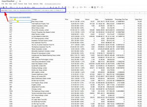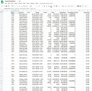 I then used this coding for NZX market, as it worked with the importHTML() function above and it brought it in just fine. I needed to maker 2 importXML() calls, one for the column header and one for the data in the body.