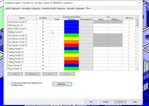 To be able to represent the information I had to make a lining wall inside the room using the Room Finisher add-in and then join the walls so the doors/windows would show through. I could then colour them using shared parameters and filters to control the colours.