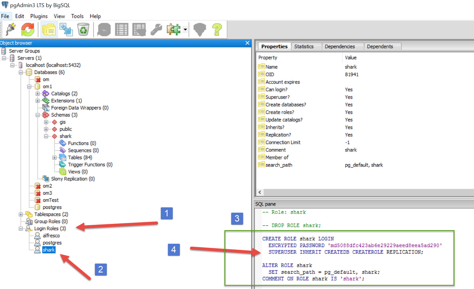 The user of shark in postgres is created by CMDBuild with the following sql