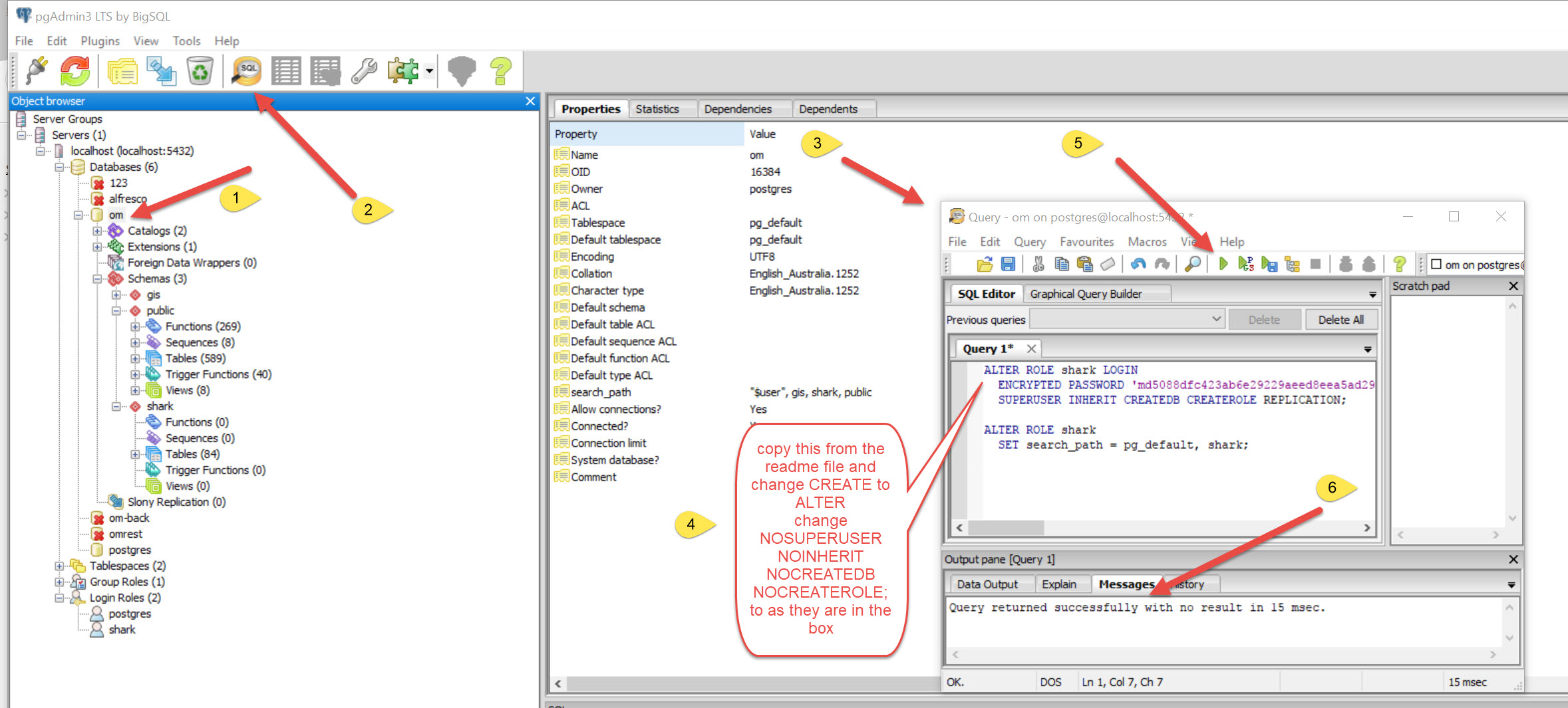 ( I noted that the Schema was changed to owned by Shark rather than postgres, but the tables in the shark schema are all still owned by postgres, and changing individual table ownership made no difference at all, it still didn’t work)