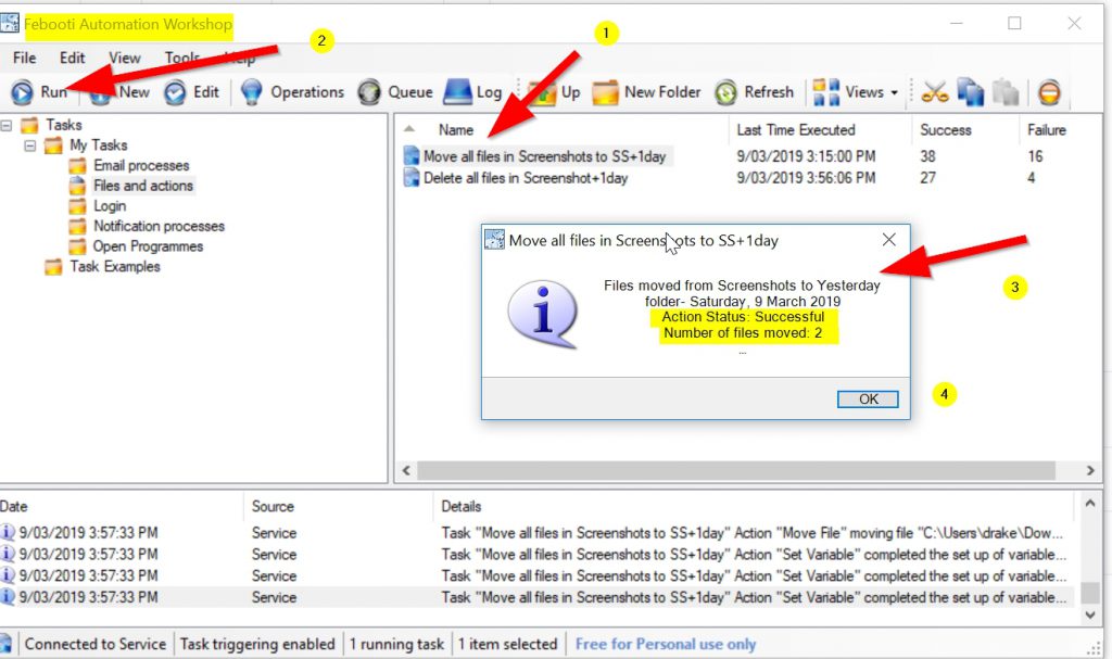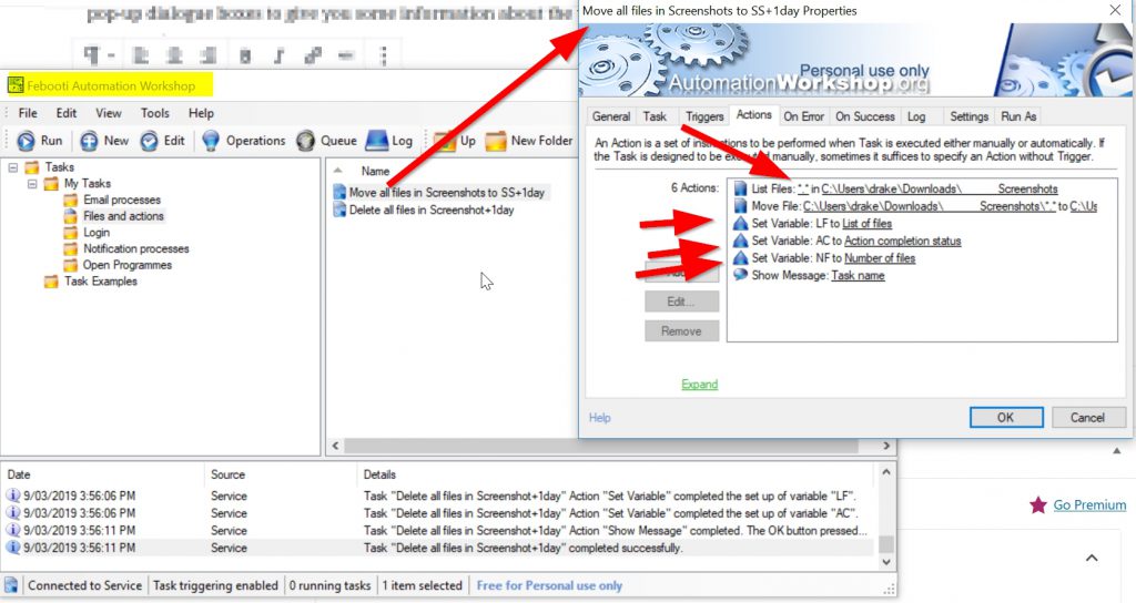I had not included pop-up dialogue boxes with my process on moving files between folders, and it has led me to go into those folders to confirm that those files have moved across, or been deleted. After exploring this feature in RoboTask Lite I saw that there is a similar option in Automation Workshop and I have assigned some variables to list file numbers, file size and action status so now, after running the macro it gives me an action status and number of files that moved (also the list of file names if I want that too, which I don’t).