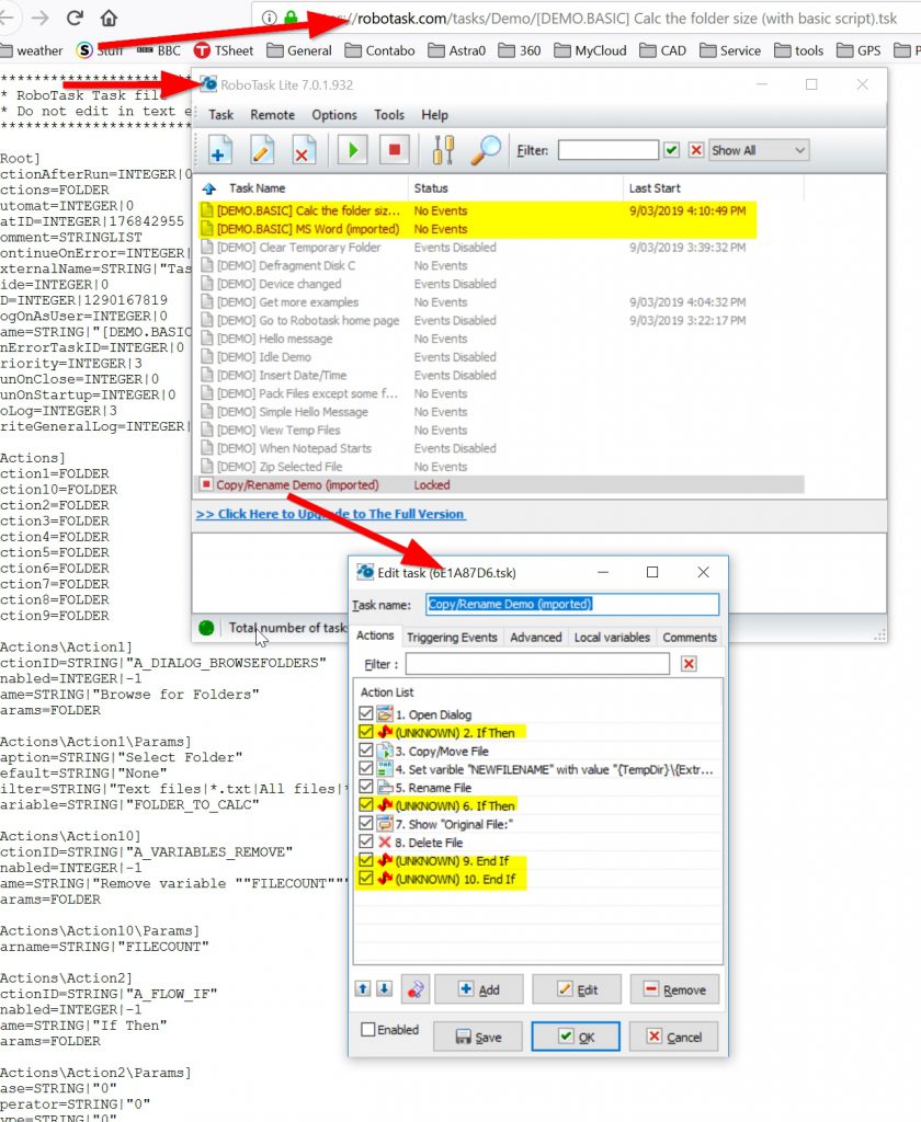 I have seen the RoboTask automation programme and it is a paid programme , for personal use its 119$US so I ignored it in my exploration for task automation tools. I found there is a free RoboTask Lite that is a cut-down version of the main product that deals with files and PC activities but has the Internet & Email functions (and possibly remote connection tools) disabled. Fair enough, the free version is supposed to be a taster for encouraging people to purchase the main product.