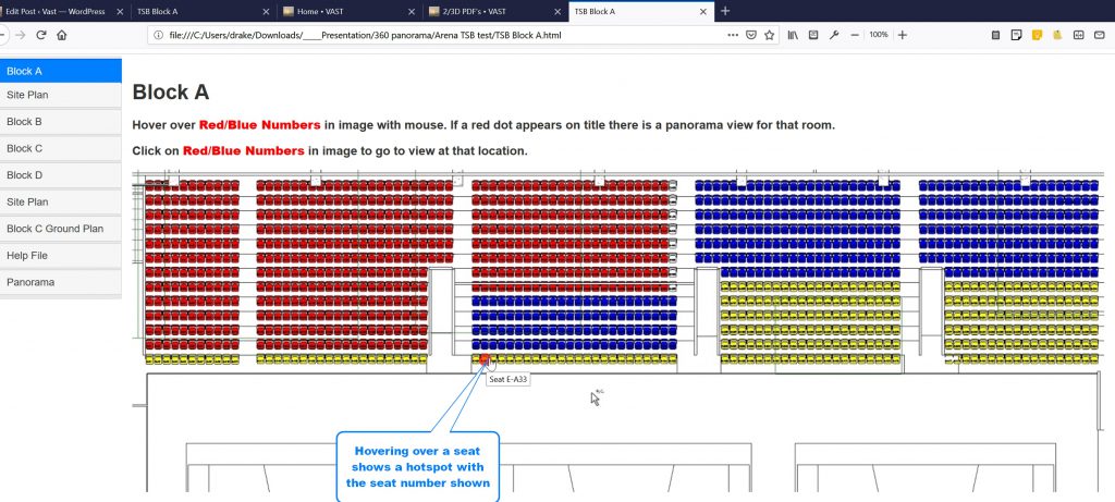 The seats are still too small to read the numbers, but if you hover over them they tell you what the seat number is. Also there is a coloured dot and clicking on that will take you to image/panorama so you can see view from that location (I don’t actually have any indoor seating panoramas as an example, I’m just linking to outside panoramas at present as this is a Proof of Concept)