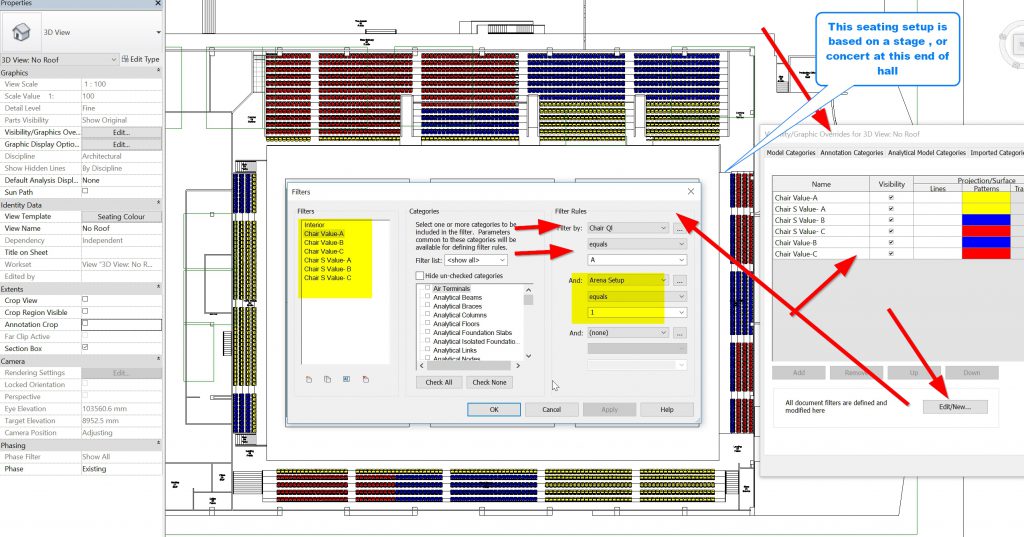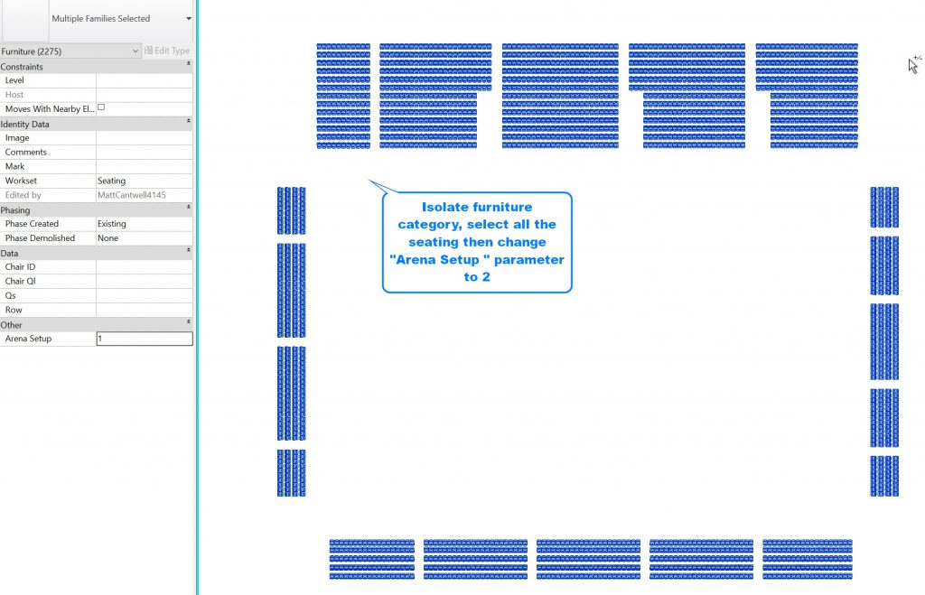 For the 3DPDF’s I just created 2 files (although you could merge them into one file) so that one showed one setup for basketball, the other the setup for the Stage/concert. As you can do a Model Tree export to Excel you get all the correct seat priorities exported.