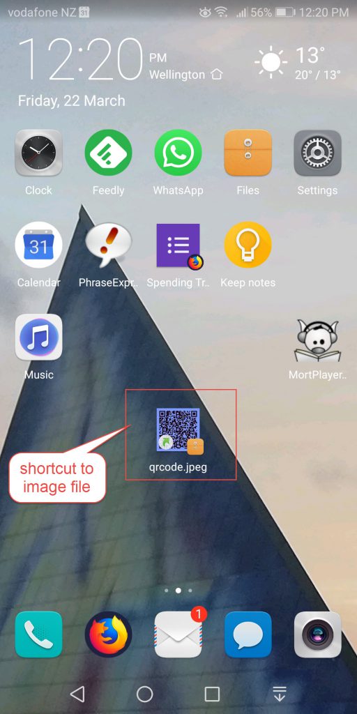 I then wondered if you could have a link to an image file (eg a barcode) on your mobile phone screen. This is not an obvious one. Usually on your phone you have apps on your screens , not individual files. So I had to look and found a video on how to do that, see below. I have a Huawei phone and that has its own file manager, that allows you to create a shortcut to the file.