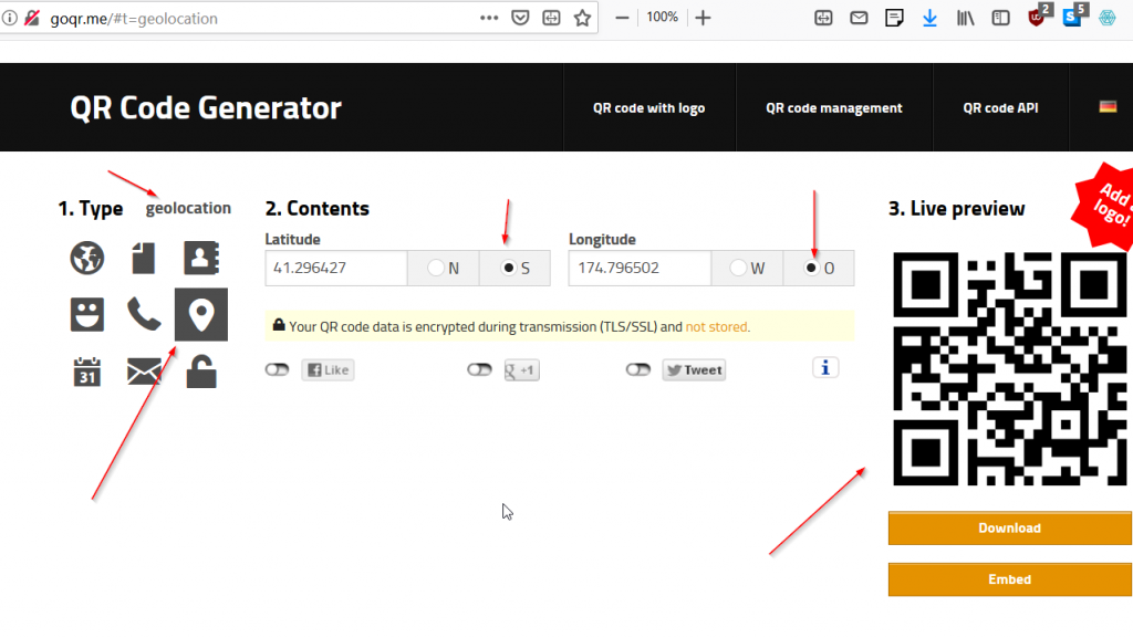 I then tried geolocation by getting my lat/long from google maps, and adding to barcode generator