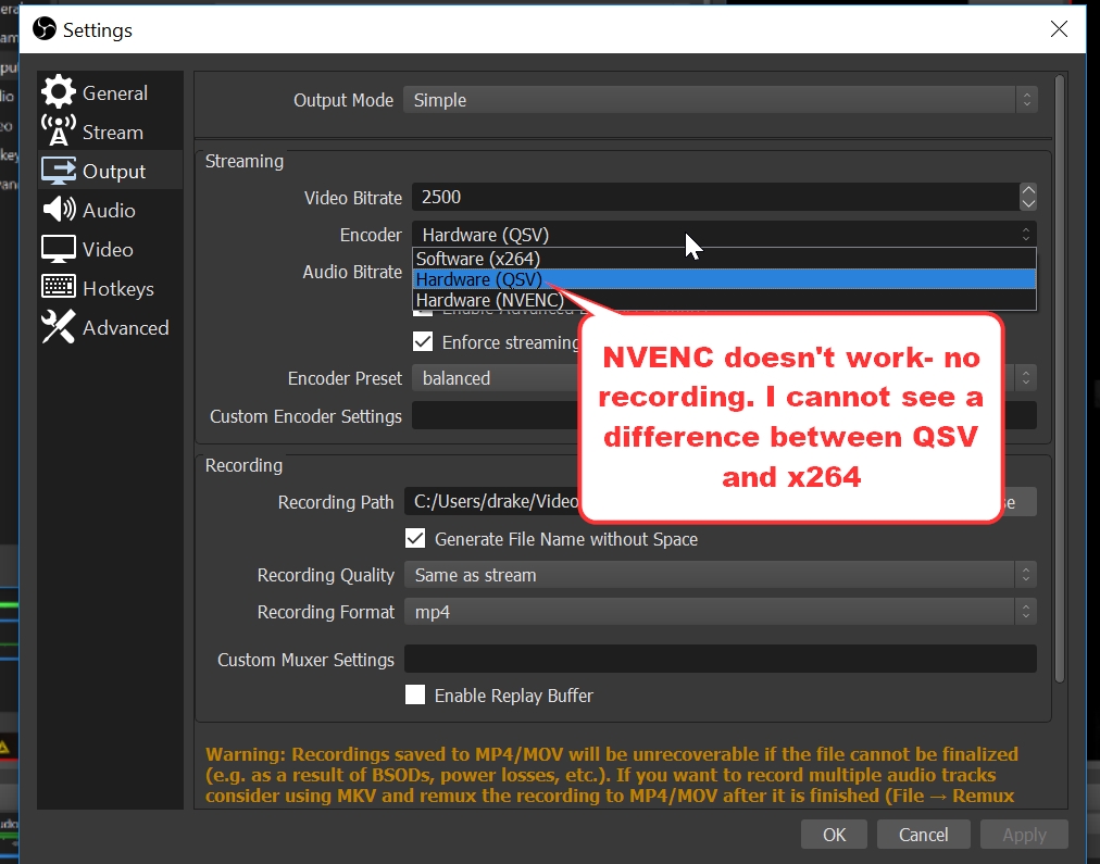 I came across another video regarding RAM on computers. I have 16GB RAM, but it seems that some programmes (Adobe Premier in the video example) allocate RAM for their programme, leaving a small amount to be shared with other programmes, so sometimes OBS cannot run as it has minimal RAM. I did note that when I raised the bitrate to about 5000 the CPU went mad and when I stopped recording it took a long time to process the video.
