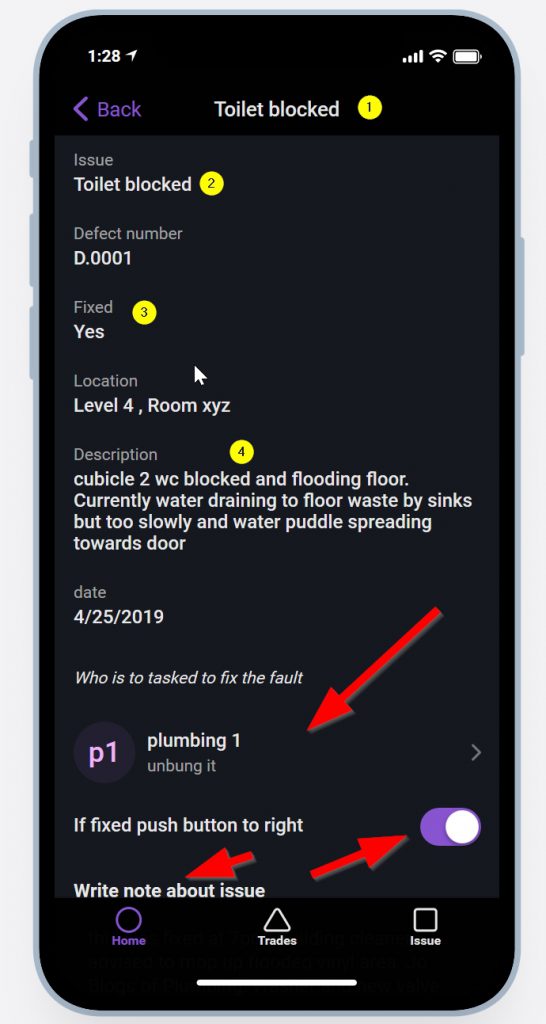 - When a tasks is completed they push the switch to the right and also add a note about the item, maybe listing parts used or hours etc (for use for their own company time/parts management) or follow up work required by other trades that the project manager can task.