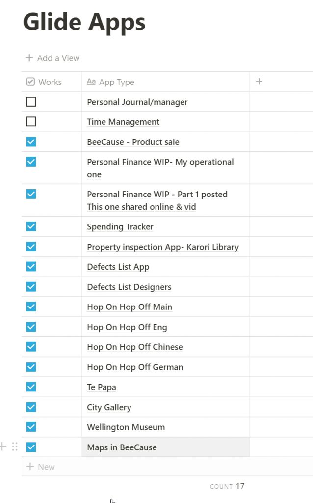 But, after playing with GlideApps for a couple of weeks now I’m beginning to understand what it can and can’t do, and I’ve just started using Notion to track those apps. Some are copies (so I can post them to the community and they can break them without messing up my working app) , list below