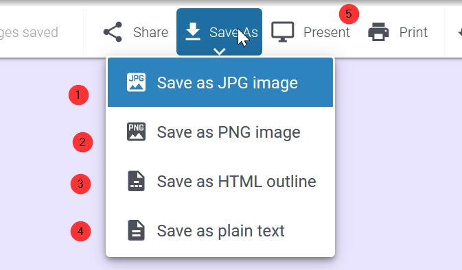 I’m just zooming in and using Greenshot to screen capture the relevant mindmap. A good way of being able to keep a few ideas built. You can save then to different formats , or even go full screen for a presentation: