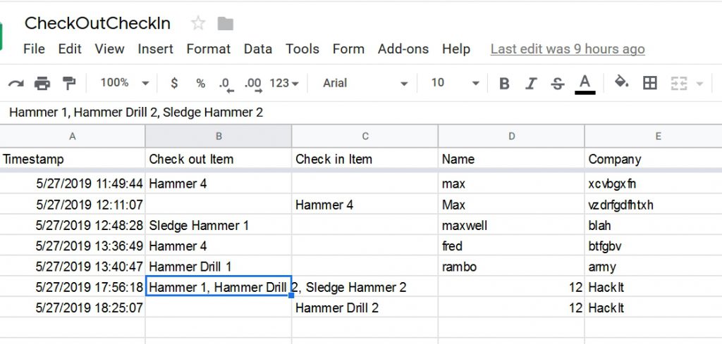 Quite a cool add-in. It also populates a Google Sheet with the data. 2 columns one saying what has been checked out and by whom,. Then when its returned it shows it in the ” Check in Item ” column, along with who checked it back in.