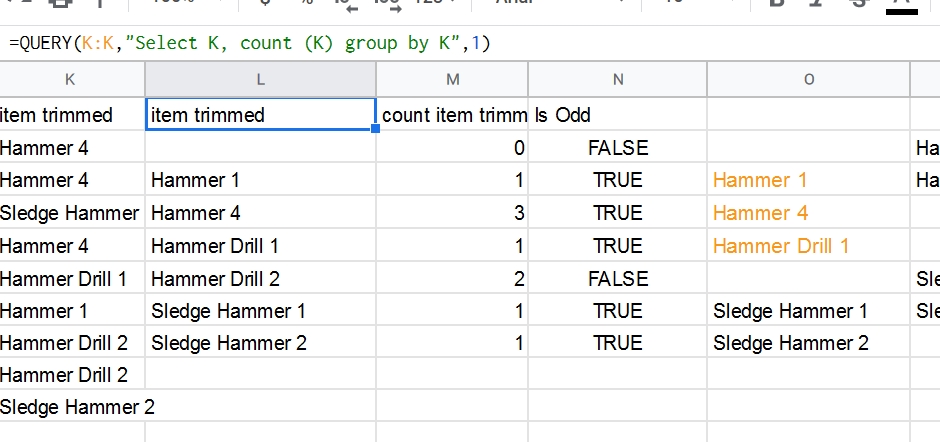 Not so fast, that sounds too easy. One of the issues is where there are multiple items all taken out together, there is a “comma” and a “space” before the next item. As we are splitting on the comma, the next string is the next item but with a space in front of it. So that string does not match anothe of the same name without the space. So we have to clean the column with : =ArrayFormula(TRIM(J2:J)) which will remove the “space” at the start of the word (I couldn’t get this to work in combination with Split, and split is supposed to have switches that will remove the space but I couldn’t get that to work either).