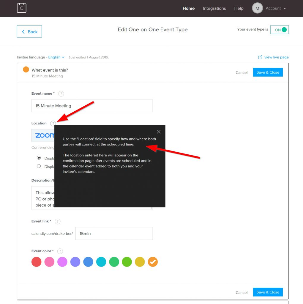 Within Calendly there is an option called “Location“. This allows you to put in a couple of options so that the person can choose a place to meet (from a list you’ve set up), or else there is a Zoom integration that allows the person to be given a Zoom link to click on that is emailed to them when they have created an appointment. On clicking the Zoom link it asks you to download a file to run and shows you how to run it, and that sets up a ZOOM programme that runs the conference, pretty much the same as GoToMeeting. It all seemed quite familiar after that.