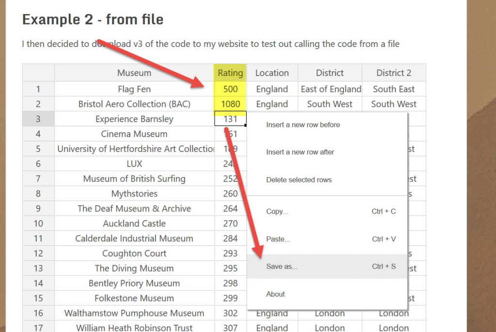 I did add some rows (right click mouse on the row numbers ) and added some data, but it didn’t save it when I refreshed the page, maybe this is because the data is embedded in the code in this case and not in a file.