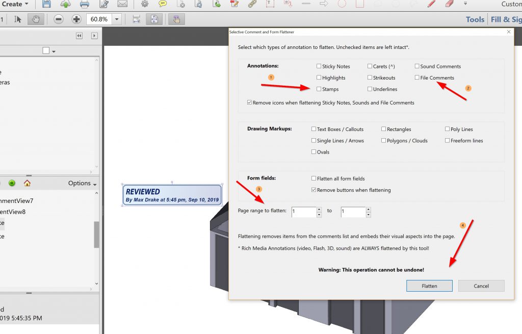 Some flattener tools do not work in 3D PDF’s as the security inbuilt for the 3D area prevent the flattener tool working. Eg the one from here.