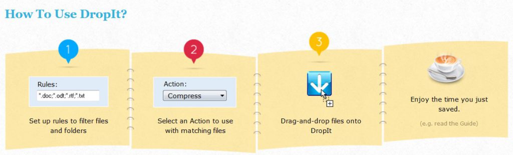 This is where you drag files from say, your desktop onto DropIt icon and it moves the different file types to different, pre-determined locations, eg Image files to a PHOTO directory, PDF files to a PDF directory etc, and for files that have no specific location to IGNORE them.