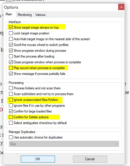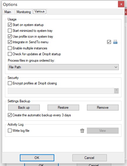 An important item in the 3rd Tab, “Various” is the Integrate in SendTo menu. This allows you, in File manager, to Right Click on File and click one of the processes to say Move selected file type to a specific directory