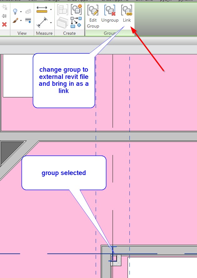 30 CONVERT REVIT GROUPS INTO LINKS . When selecting the group you get the choice to convert to an external link (new revit file, or select an existing revit file). This is handy if you’ll be using that group in another project. Also handy for splitting say shell away from interior into distinct files, or Structural away from architecture. Create a group of structural elements and send off to new file.