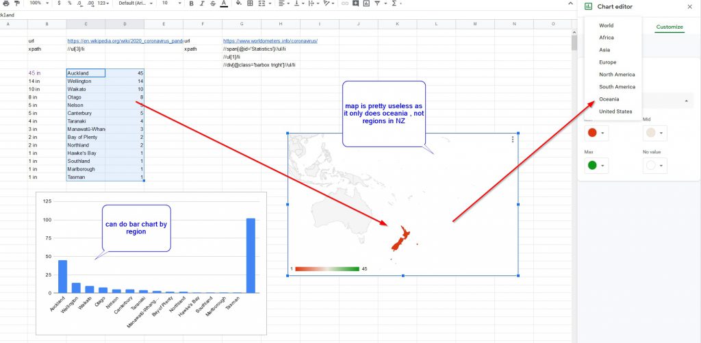 and then used : =IMPORTXML($C$2,C3) to import the numbers confirmed in each region.