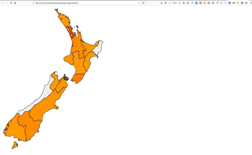 If I put this in an HTML file I get map of NZ in black, so I need to be able to control the fill of the regions. As per the Wiki page I need to colour code based on numbers in the region. I’ve used the wiki page and an Xpath